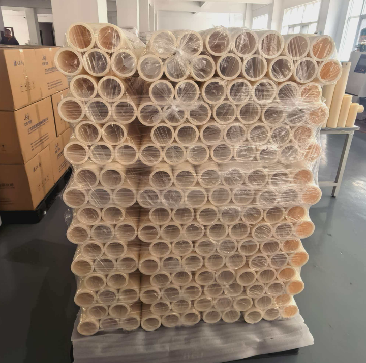 Vi har omfattende optimalisert emballasjedesignet for denne batchen med ABS-kjernerør for å sikre transportsikkerhet og produktbeskyttelse. Hver forsendelse bruker standardisert palletert emballasje: rør er først innkapslet i høystyrke gjennomsiktige støvtette poser for effektivt å forhindre inntrengning av støv og fuktighet; deretter forsterket med flere lag matvarekvalitetsfilm for å forbedre slagfasthet og fuktbeskyttelse; Det ytterste laget har tilpassede bølgepappesker som omslutter varene tett, festet med grønne stropper for å garantere en stabil og pålitelig total emballasjestruktur. Som illustrert, er de emballerte varene stablet pent med skarpe kanter, noe som til fulle viser vår profesjonalitet og nøyaktighet i logistikkbeskyttelse.